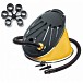 Ножной насос для наполнения воздухом надувных пляжных аттракционов, небольших надувных лодок или спасательных плотов с камерой объемом 5 литров, опорные поверхности которого выполнены из прочного ребристого пластика. Размеры: 27 х 18 х 6 см. Комплектуется набором переходников для различных клапанов.